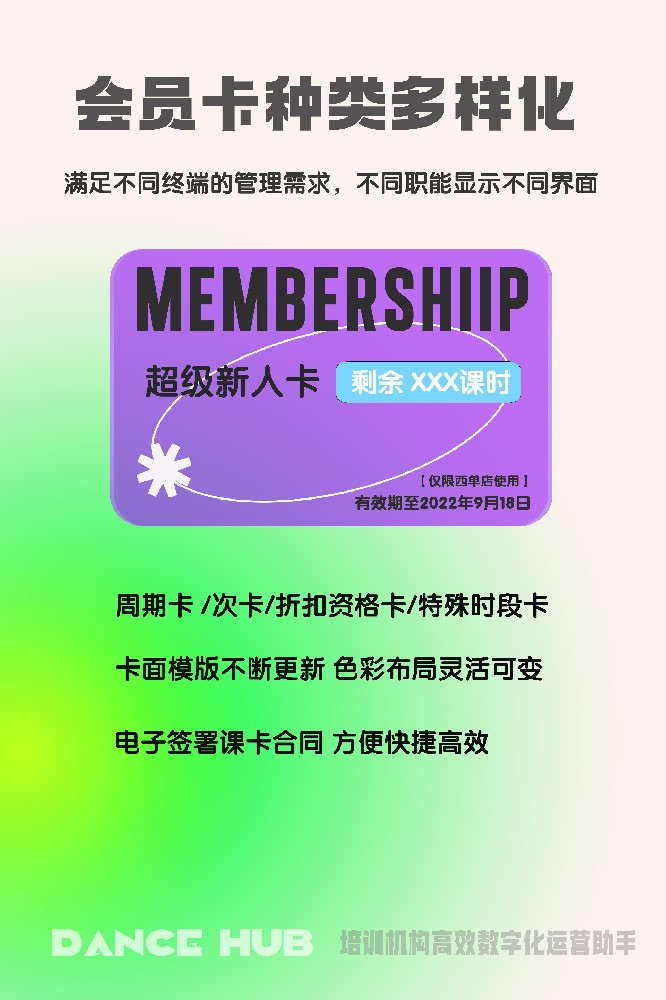不再需要办理实体卡,小程序内置卡种管理系统会员卡消费明细在个人用户端一目了然方便查询支持少儿和成人卡项在同一用户名下
