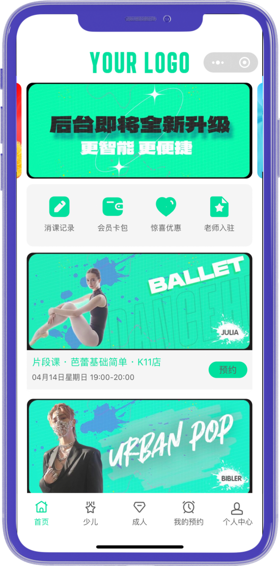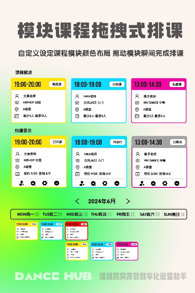 工作室轻松排课,学员小程序便捷约课 常规课 集训课 小班课 私教课轻松设定 上课前微信消息自动提醒,避免忘记 会员到店扫码后电脑自动播报签到成功无需查验 课程轻松复制到下周或者指定日期,无需重复设定